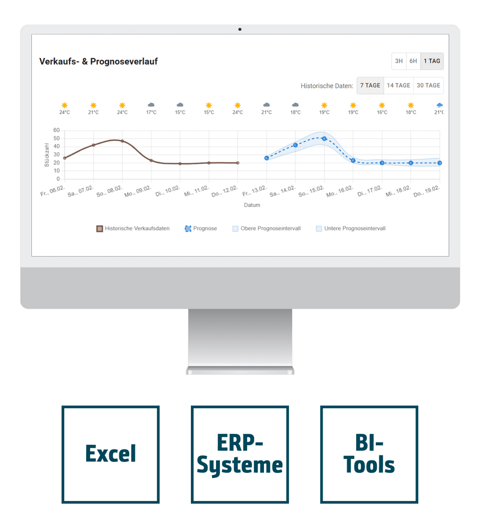Wir verstehen uns bewusst als Service und erweitern Ihre bestehende Planungswelt um hochwertige KI-basierte Prognosedaten. Diese stellen wir Ihnen flexibel zur Verfügung: Sie können sie als belastbare Bedarfsprognose in SAP oder Excel nutzen oder in Ihren BI-Tools weiter ausbauen, um das volle Potenzial auszuschöpfen.