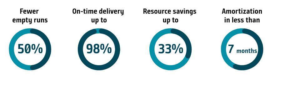 The central system always has complete visibility into all orders, vehicle positions, and available resources. It evaluates priorities and distances, compares capacities, and automatically assigns the resource that can execute the task most efficiently. This leads to optimally distributed transports, fewer empty runs, and early detection of potential bottlenecks. Companies achieve delivery reliability of up to 98 percent and resource savings of up to 33 percent.
