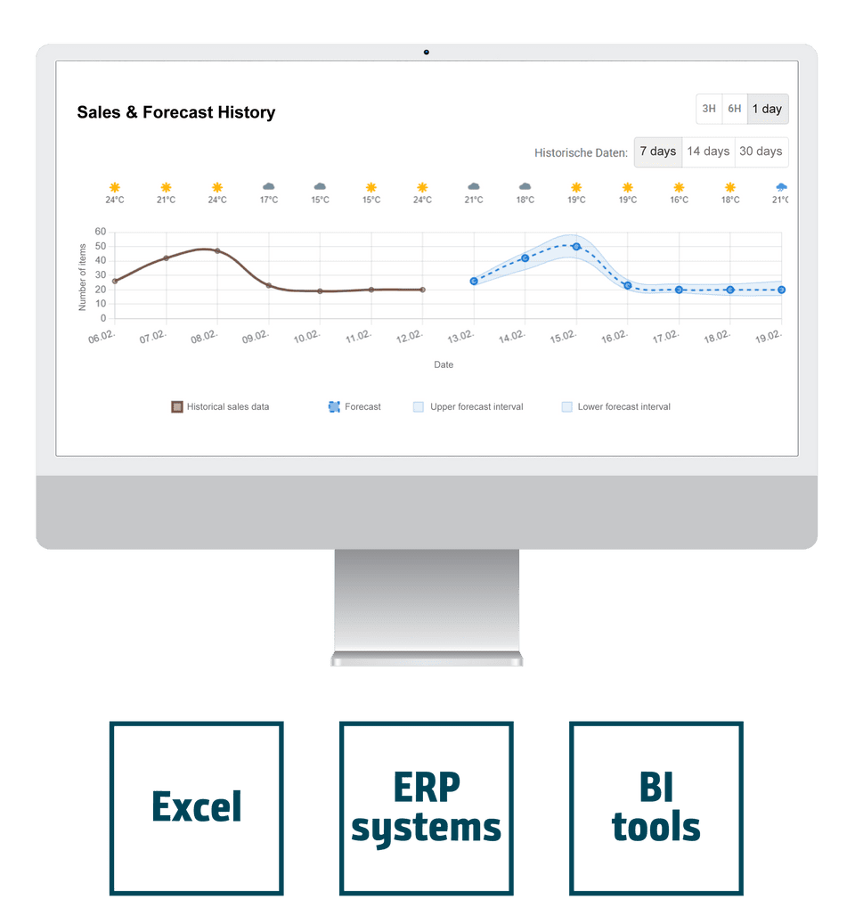 We deliberately position ourselves as a service and enhance your existing planning environment with high-quality, AI-based forecasting data. These are provided to you flexibly: you can use them as a reliable demand forecast in SAP or Excel, or further develop them within your BI tools to unlock their full potential.